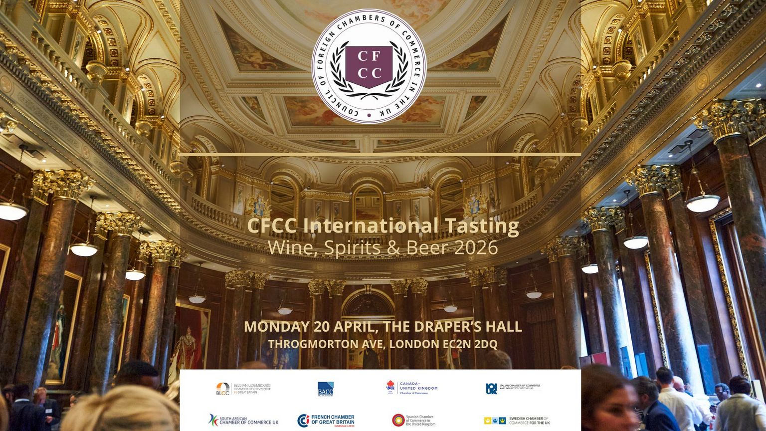 Join us on 20th April at the historic Drapers’ Hall, Throgmorton Avenue, London EC2N 2DQ. Experience an evening of global flavours right in the heart of the City, featuring a curated selection of wines, spirits, and beers from foreign Chambers of Commerce.