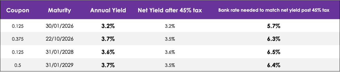 An alternative to cash for individuals is the purchase of Gilts, which are bonds issued by the UK Government. Buying short-dated Gilts with low coupons can be an attractive tax-efficient cash alternative. This is mainly because only the small coupon attracts income tax at the individual’s marginal rate (if it is outside your Personal Savings Allowance), whilst no tax is payable on the capital gain element of the Gilt. The below table illustrates the tax advantage with an example of an additional rate taxpayer.