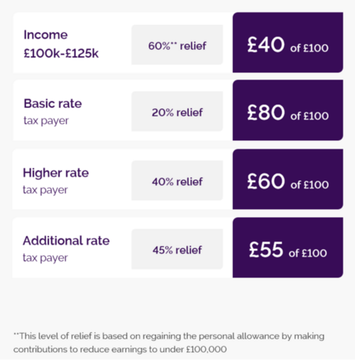 - Tax relief on contributions: Contributions up to the Annual Allowance are made from gross income, reducing your taxable income. The Annual Allowance is the total amount of contributions that can be paid into all pensions for an individual before a tax charge applies. Your Annual Allowance is up to £60,000 per year, or up to 100% of earnings, whichever is lower. This will potentially reduce to £10,000 if you have already accessed your pension or if your income is over £260,000.